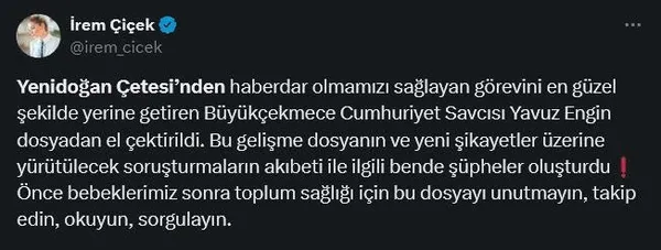 Adalet Bakanı Yılmaz Tunç, yalan haberlere ilişkin sosyal medyadan paylaştığı açıklamasında şu ifadeleri kullanmıştı: “Kamuoyunda “Yenidoğan Çetesi” olarak bilinen soruşturma dosyasını yürüten Cumhuriyet Savcısı Yavuz Engin’in görevden alındığına yönelik yapılan haberler gerçek dışıdır. Büyükçekmece Cumhuriyet Başsavcılığı’nın yürüttüğü soruşturmada hazırlanan fezleke, suçun Ağır Ceza Mahkemesi’nin görev alanına girmesi nedeniyle bağlı olduğu Ağır Ceza Mahkemesinin bulunduğu Bakırköy Cumhuriyet Başsavcılığı’na gönderilmiştir. Şüpheliler hakkında da Bakırköy Ağır Ceza Mahkemesi’ne kamu davası açılmıştır. Cumhuriyet Savcımızın görevden alınması söz konusu olmayıp Büyükçekmece Cumhuriyet Başsavcılığı’ndaki görevine devam etmektedir. Ayrıca Büyükçekmece Cumhuriyet Savcısı’nın tehdit edilmesi ile ilgili olarak ve yine aynı konuda diğer şüpheliler bakımından soruşturma Büyükçekmece Cumhuriyet Başsavcılığı’nda titizlikle yürütülmektedir. Doğruluğunu teyit etmeden, sosyal medyada yargıyı yıpratmaya yönelik dezenformasyon içeren bir yalan haberi ana muhalefet partisinin sözcüsünün paylaşıyor olması da büyük sorumsuzluktur.”